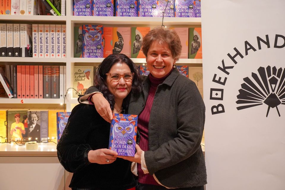 Forugh Karimi is an author and psychiatrist who fled the war in Afghanistan and arrived in the Netherlands at age 25. In 2022, Karimi made her debut with the novel The Mothers of Mahipar — which won the Hebban Debut Prize — followed in 2023 by the novella Nargis, both published by Meridiaan Uitgevers. With her second novel, In My Eyes I Carry Clouds (In mijn ogen draag ik wolken) she once again demonstrates her unique contribution to the Dutch literary landscape. In the picture below, the author with her editor, Nelleke Geel: