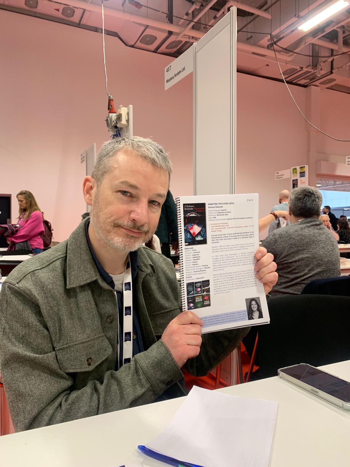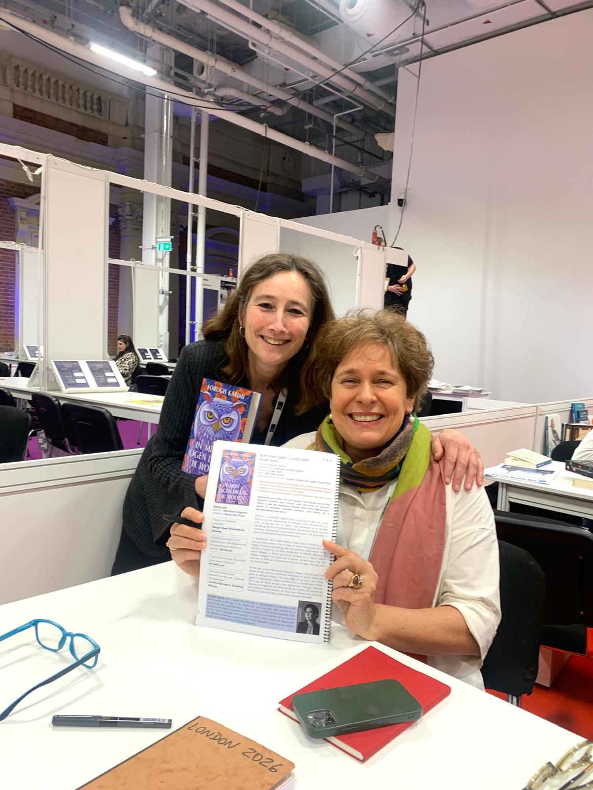 In the photos above, Anna Soler-Pont with Nelleke Geel (left), from Dutch house Meridiaan Uitgevers. Nelleke published the 2026 Dutch Booksellers Prize-winning novel In My Eyes I Carry Clouds (In mijn ogen draag ik wolken) by Dutch-Afghan author Forugh Karimi. Rights worldwide are represented by Pontas and all translation (except Korean) and audiovisual rights are available. We're also pleased to share that right after our meeting in London, Meridiaan pre-empted Dutch translation rights to The Price for Being Born, Mallorcan author Laura Gost's forthcoming novel, to be published in the original Catalan and translated into Spanish in September 2026. French and World English rights to the novel were also pre-empted days after the fair. Pictured on the right, we also caught up with Johann Defer, the editorial director at Folio, Gallimard's pocket imprint, for their thriller collection. Folio has just published the pocket edition of the French translation of Awaiting the Flood (Esperando al Diluvio) by Spanish bestselling author Dolores Redondo in a sleek new design (above right) while Gallimard published her latest novel Those Who Don't Sleep NASH (Las que no duermen NASH) in a trade edition.