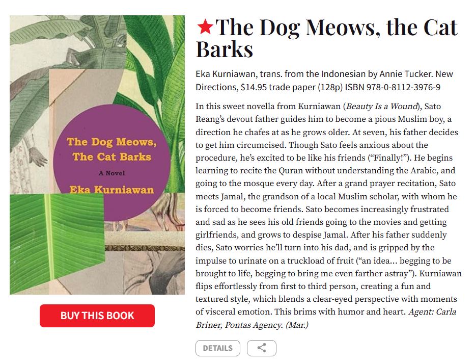 Eka Kurniawan’s new work, a novella, The Dog Meows, The Cat Barks (original title: Anjing Mengeong, Kucing Menggonggong) was originally published in Indonesia by Gramedia in July 2024 and will be published in English by New Directions in the US in March 2026 and by Pushkin Press in the UK in May 2026. The book will also be published in English in India by Speaking Tiger and in South East Asia by Monsoon Books, who have just revealed their cover design: